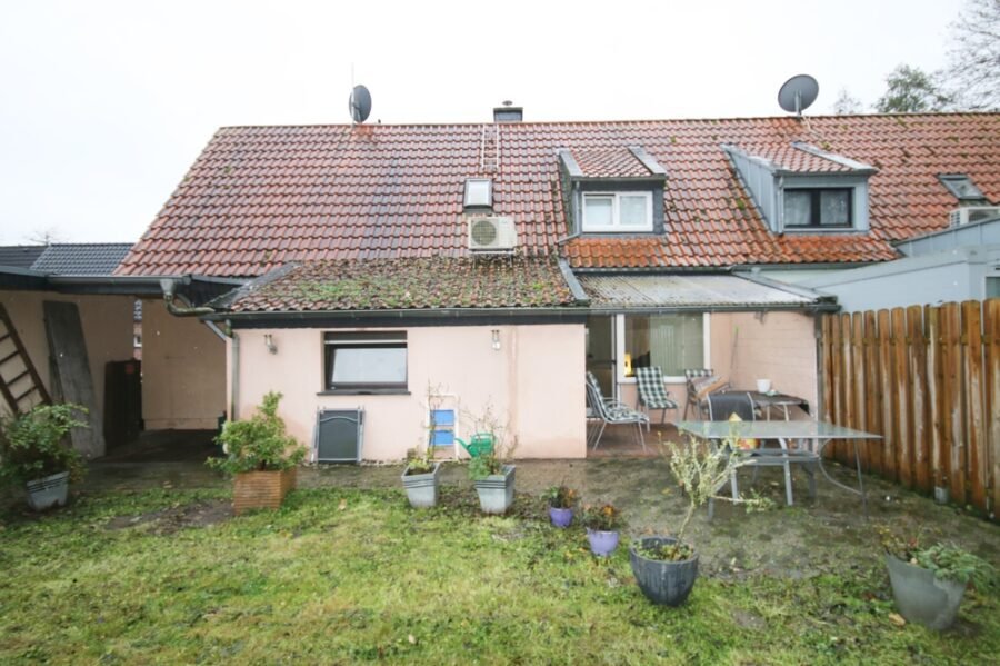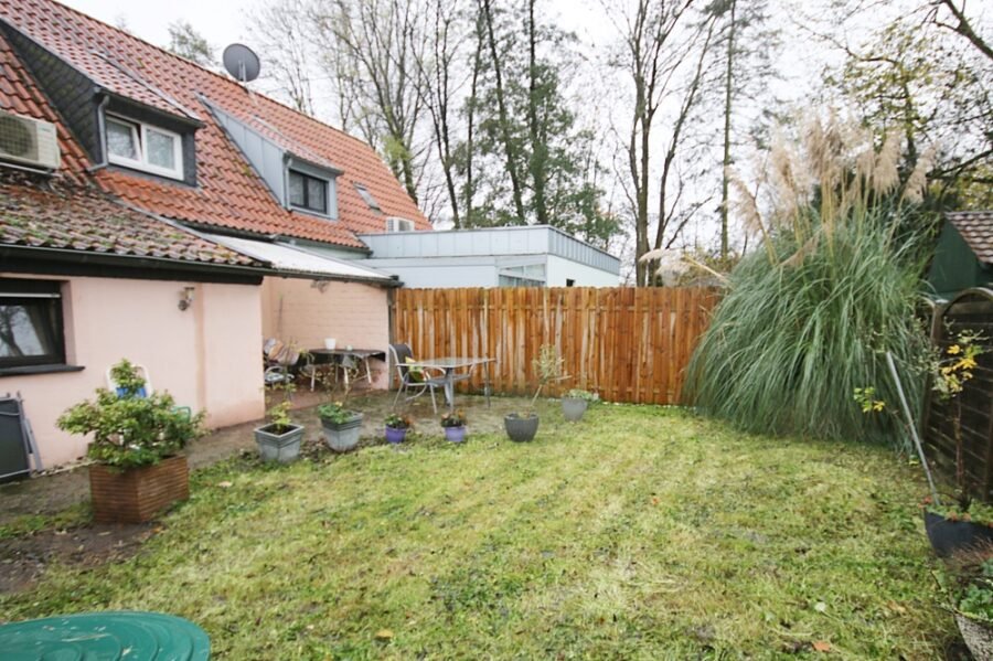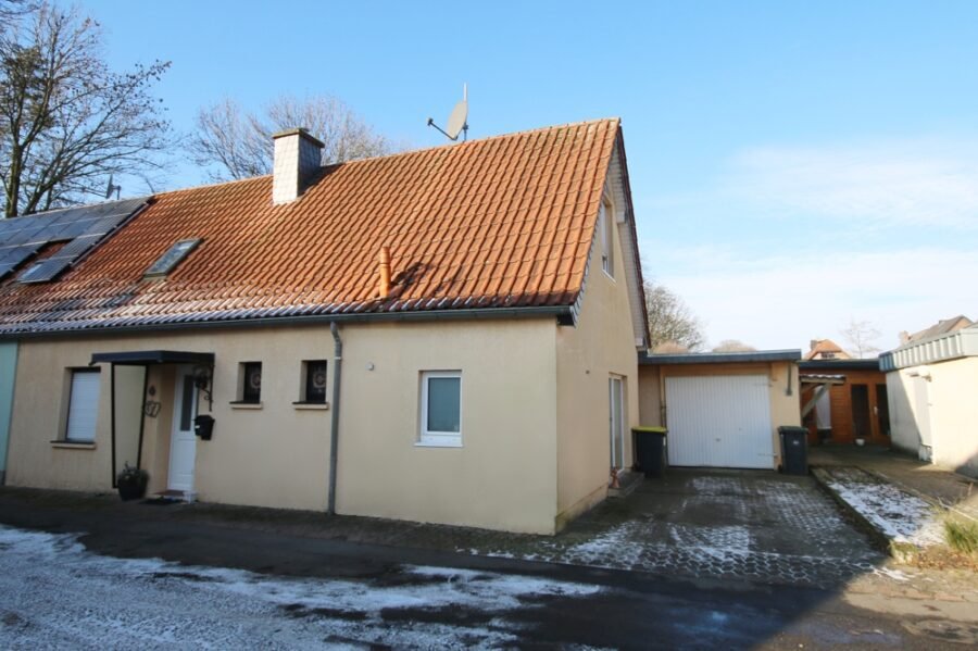 Die sichtgeschützte Terrasse ist überdacht, eine weitere gepflasterte Fläche als Freisitz angelegt und der Gartenbereich umzäunt. Zur Immobilie gehört weiterhin eine überdimensional große Garage mit Fenster sowie ein zusätzlicher Pkw-Stellplatz.