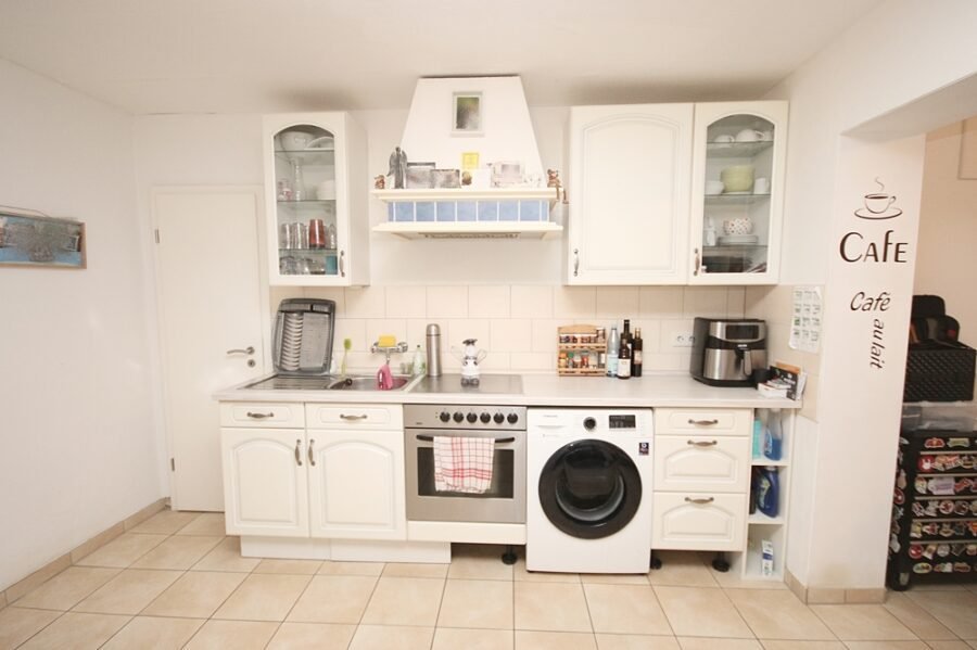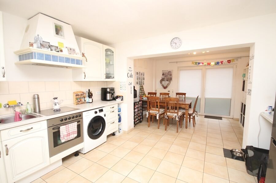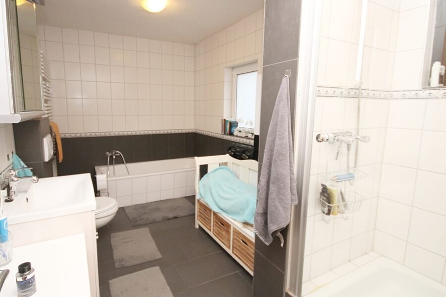 Im Erdgeschoss befinden sich die Diele, das Wohnzimmer mit Zugang zur überdachten Terrasse und zum Garten, die Wohnküche mit Essbereich und Vorratsraum sowie das Tageslichtbad mit Badewanne und Dusche, WC, Waschtisch und Handtuchheizkörper.