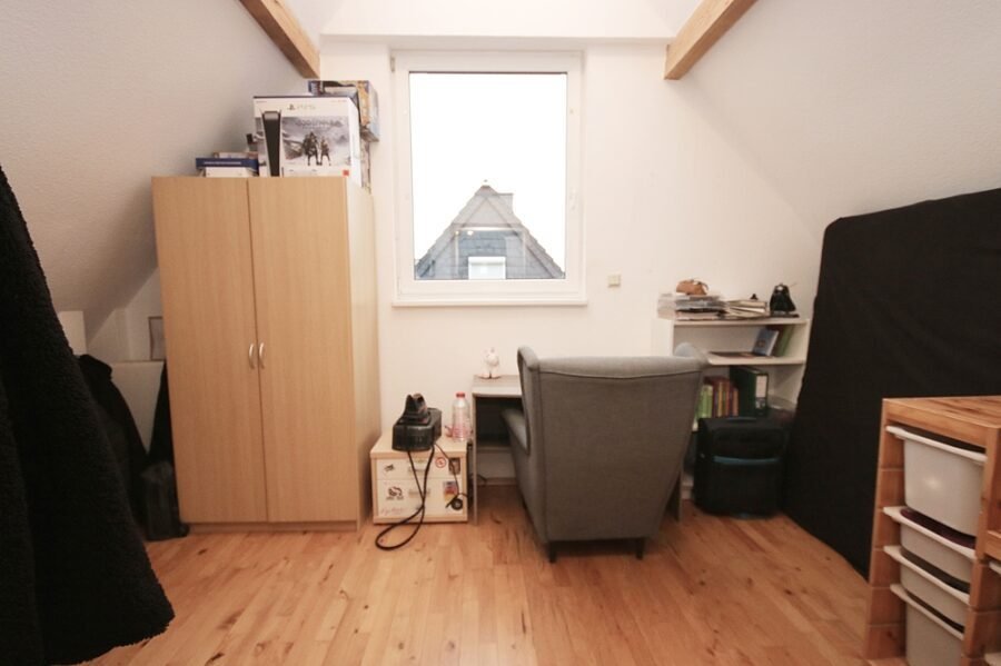 Das Obergeschoss ist unterteilt in Kinderzimmer, Schlafzimmer und Arbeitszimmer sowie einen kleinen Abstellraum. Das Arbeitszimmer kann direkt vom Schlafzimmer aus begangen und je nach Wunsch auch wunderbar als Ankleidezimmer eingerichtet werden.